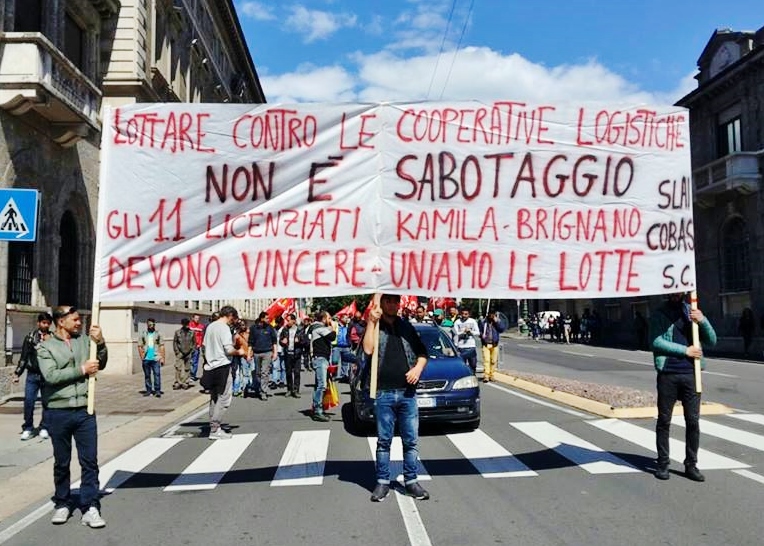 Bergamo. Nel solito tran tran di una giornata lavorativa settimanale compare la lotta di classe e ha i volti di facchini, operatori della logistica delle ditte della bergamasca e non solo. Martedi 9 maggio infatti un centinaio di lavoratori sono scesi in piazza per difendere 11 operai del magazzino Kamila di Brignano assunti dalle cooperative di Cisa e Cls, licenziati con l’accusa di boicottaggio e sabotaggio. Tra di loro ci sono anche 4 delegati dello Slai Cobas S.C. Al presidio, svoltosi davanti al tribunale di Bergamo, è seguito un corteo verso la prefettura cui hanno preso parte, al seguito dello striscione dello SLAI Cobas S.C., due delegazioni di USB e del Si Cobas, accorse a portare la propria solidarietà.