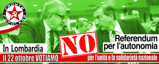 Fronte Popolare s’impegnerà nella campagna per il NO al referendum consultivo sulla cosiddetta autonomia indetto dalla Regione Lombardia per il 22 ottobre. Riteniamo sia nostro dovere, come comunisti, contrastare in modo aperto, chiaro ed argomentato il processo di disintegrazione dell’unità nazionale e della solidarietà tra le cittadine e i cittadini italiani apertosi ormai da decenni, di cui questa consultazione, a dispetto delle recondite finalità di spartizione del potere all’interno della Lega Nord, rappresenta un passaggio ideologicamente importante.