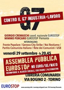 Appare sempre più evidente la necessità di lavorare alla ricostruzione di una prospettiva di classe che ponga chiaramente la questione della rottura di Unione Europea, Euro e Nato come condizione necessaria per fermare l’attacco pluridecennale al lavoro, allo stato sociale, ai diritti e alla democrazia. Dopo le mobilitazioni del 21-22 ottobre e del 25 marzo scorsi, in un percorso che ha portato all’Assemblea Costituente del primo luglio, Eurostop prosegue il proprio lavoro in questa direzione. Parteciperà alle mobilitazioni contro il G7, sia presenziando con un proprio spezzone al corteo di sabato 30 settembre, che lanciando venerdì 29 un’assemblea pubblica cui interverranno le diverse realtà che sul territorio stanno lavorando alla costruzione di Eurostop e cui sono invitati a partecipare tutti gli interessati.