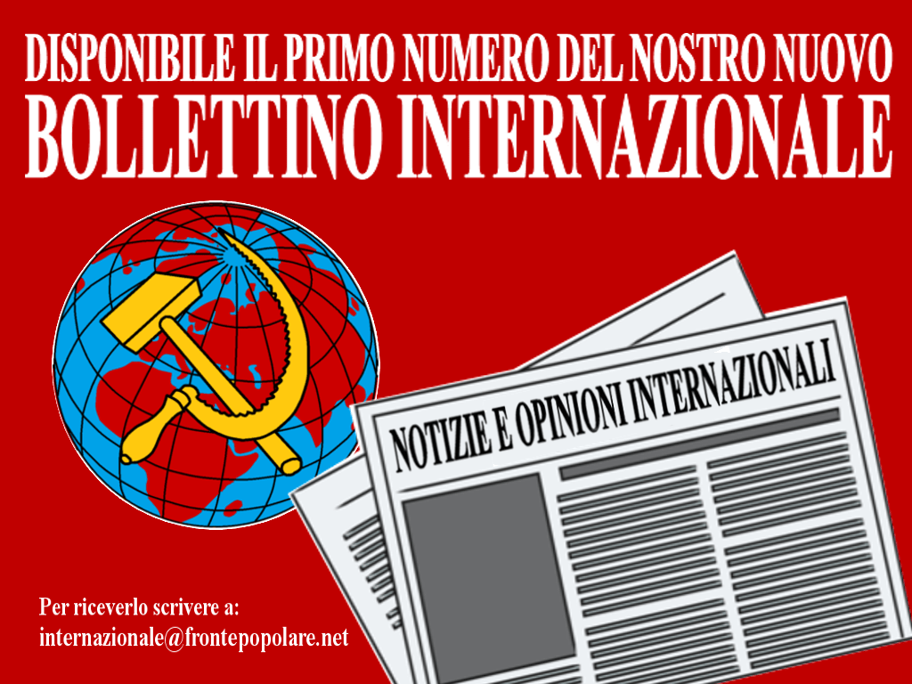 In questi giorni il nostro lavoro internazionale registra un risultato di grande importanza: vede la luce il primo numero del bollettino “Notizie e opinioni internazionali” nato su iniziativa di Fronte Popolare, del Polo di Rinascita Comunista in Francia (PRCF) e del Partito dei Lavoratori Britannico (WPB).