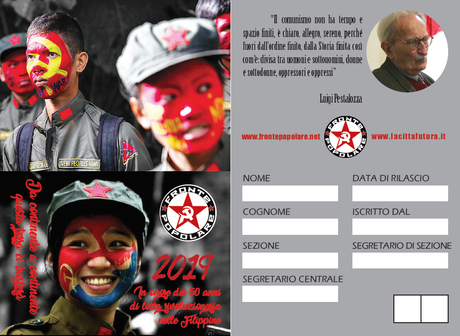 2019 FronteRetro Publicato 13 dicembre 2018 alle 932 × 681 li Fronte Popolare dedica il tesseramento 2019 alla lotta rivoluzionaria del popolo filippino Successivi →