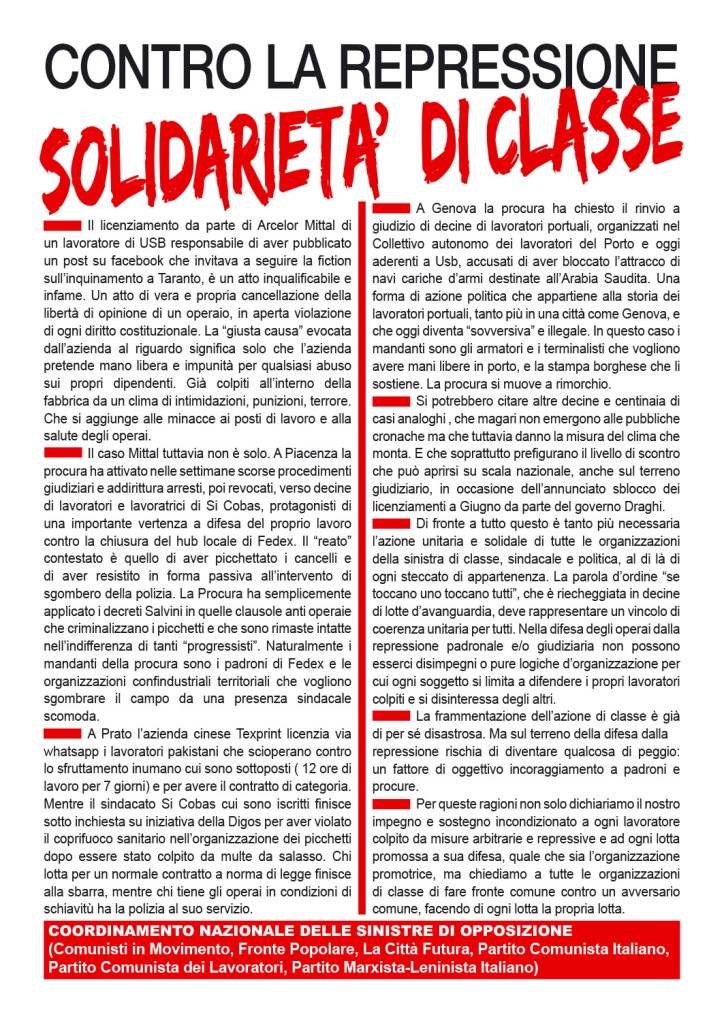 Comunicato del Coordinamento Nazionale delle Sinistre di Opposizione (Comunisti in Movimento, Fronte Popolare, La Città Futura, Partito Comunista Italiano, Partito Comunista dei Lavoratori, Partito Marxista-Leninista Italiano)