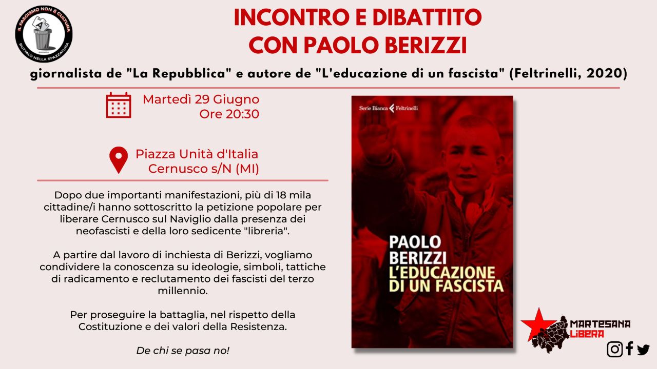 Il prossimo 29 giugno, dalle ore 20.30, il coordinamento delle realtà territoriali di Martesana Libera, del quale Fronte Popolare Milano e la sua cellula Fronte Popolare – Est fanno parte dalla sua nascita, organizza un evento di discussione insieme al giornalista de La Repubblica Paolo Berizzi per “condividere la conoscenza su ideologie, simboli, tattiche di radicamento e reclutamento dei fascisti del terzo millennio” come si legge nella descrizione dell’evento Facebook.