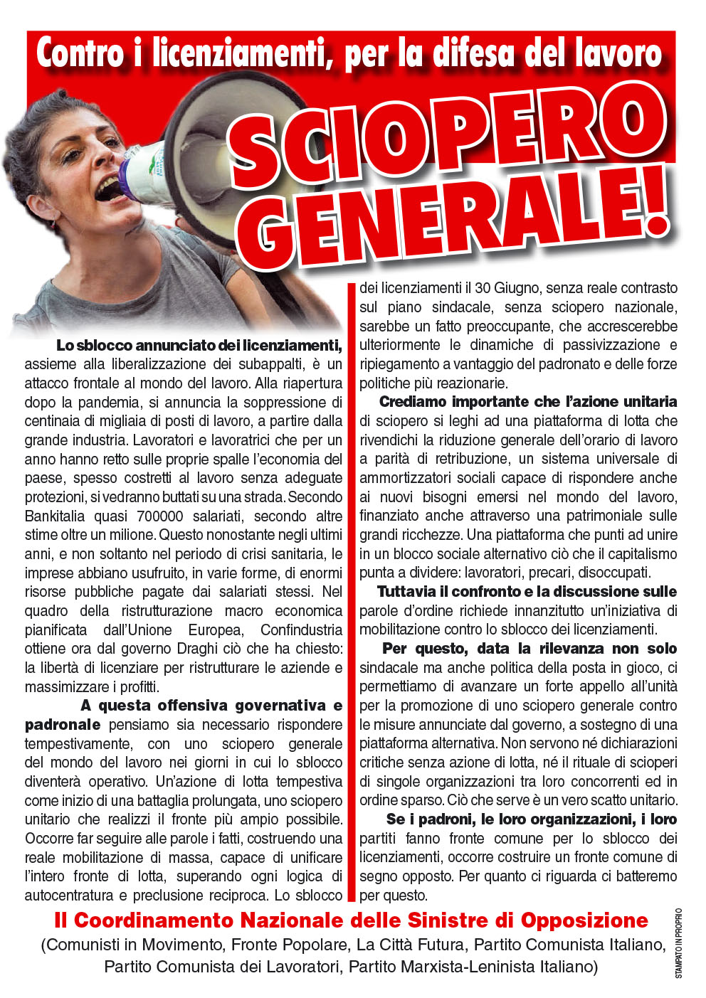 Occorre far seguire alle parole i fatti, costruendo una reale mobilitazione di massa, capace di unificare l’intero fronte di lotta, superando ogni logica di autocentratura e preclusione reciproca. Lo sblocco dei licenziamenti il 30 Giugno, senza reale contrasto sul piano sindacale, senza sciopero nazionale, sarebbe un fatto preoccupante, che accrescerebbe ulteriormente le dinamiche di passivizzazione e ripiegamento a vantaggio del padronato e delle forze politiche più reazionarie.