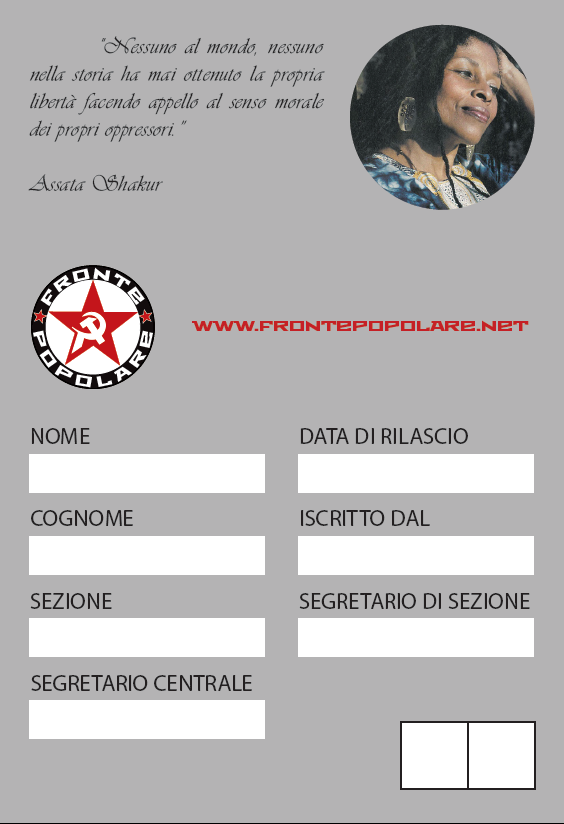 L’interno della tessera rende omaggio ad Assata Shakur (1947), rivoluzionaria statunitense afroamericana, ex membro del partito delle Pantere Nere, e successivamente del Black Liberation Army (BLA).