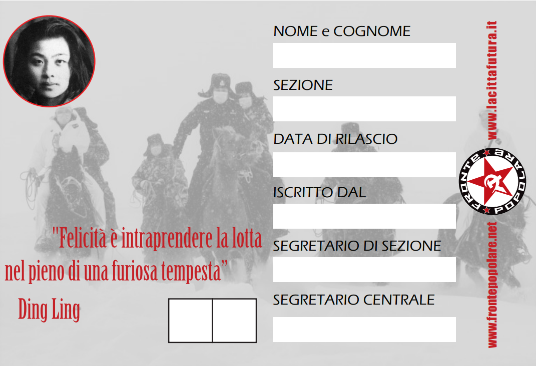 L’interno della tessera rende onore alla memoria del partigiano, intellettuale e dirigente del Partito Comunista Italiano Luigi Pestalozza, amico della nostra organizzazione scomparso nel 2017, con una citazione dal suo ultimo libro, “Appunti” (Edizioni Nemesis 2015), che ben rappresenta il senso che Fronte Popolare attribuisce alla militanza comunista: